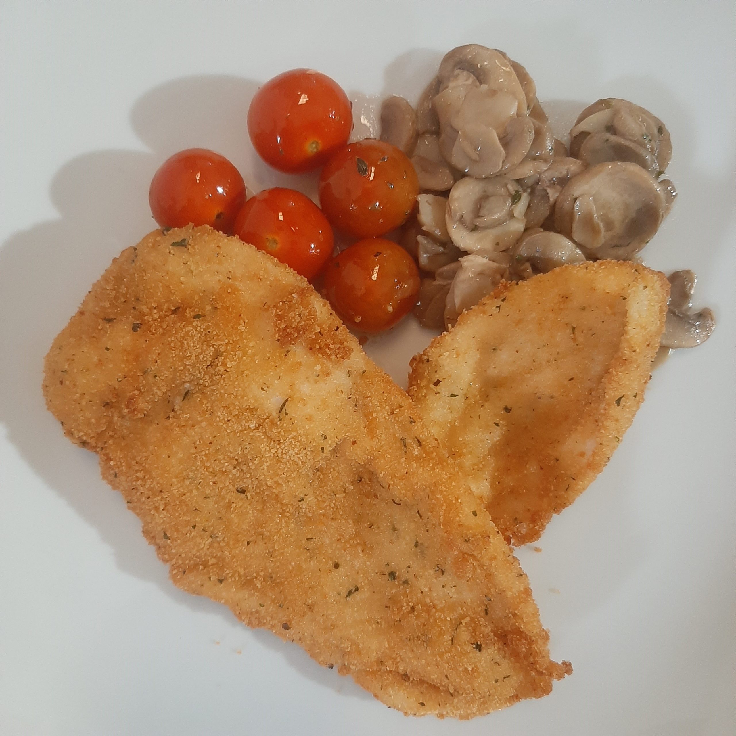 Pechuga de pollo, huevo, pan rallado, champiñones, tomates cherry, ajo, perejil, sal y aceite de oliva.